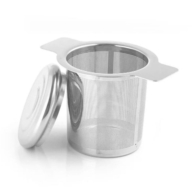 - Wyposażony w uchwyt zintegrowany z sitkiem oraz elegancką, stalową pokrywkę.