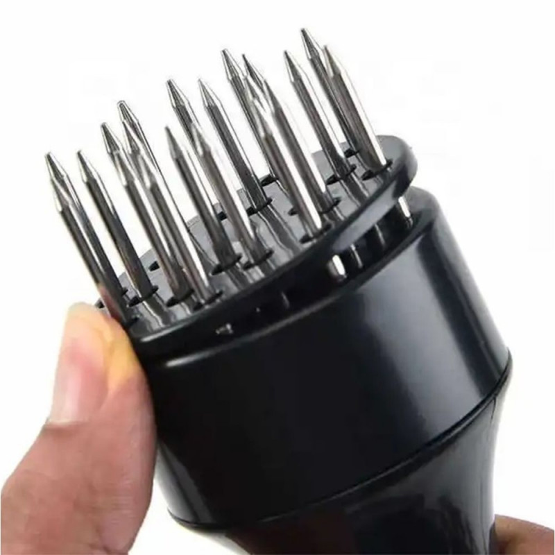 Nakłuwacz do mięsa stanowiący świetną alternatywę dla klasycznego tłuczka. Służy do rozdrabniania włókien przed ich dalszą obróbką. Wyposażony został w długi i wygodny uchwyt oraz aż 16 stalowych igieł, które świetnie rozbijają mięso. Produkt posiada nakładkę zabezpieczającą, która automatycznie chowa ostrza gdy z niego nie korzystamy. Dodatkowy otwór w górnej części rękojeści umożliwia zawieszenie tłuczka na haczyku / wieszaku.