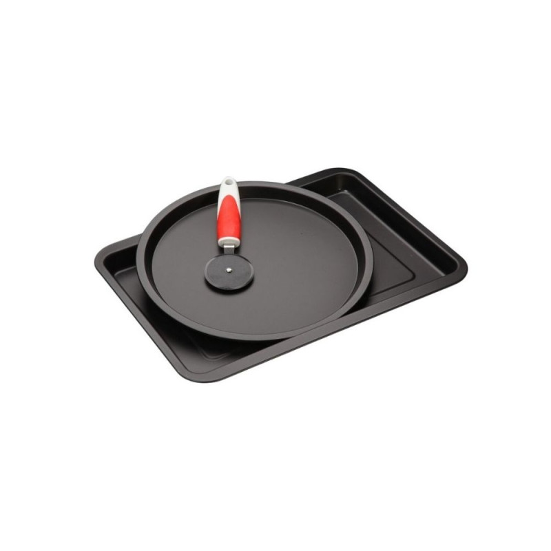 Set for baking pizza and focaccia, with pizza cutter. Perfect cooking is ensured by even heat distribution thanks to the ideal thickness of the pan. Tray size: 26 x 37 cm Pizza pan diameter: Ø28 cm. ColWarning: Last items in stock!