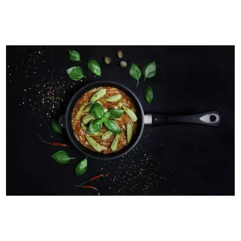 The pan’s thermal base is designed for fast heating and even heat distribution. This not only ensures an efficient cooking experience, but also helps save energy. Thanks to its excellent heat retention, you can cook without excess fat, contributing to healthier meals. The pan is suitable for all heat sources, including induction, making it a versatile addition to any kitchen.