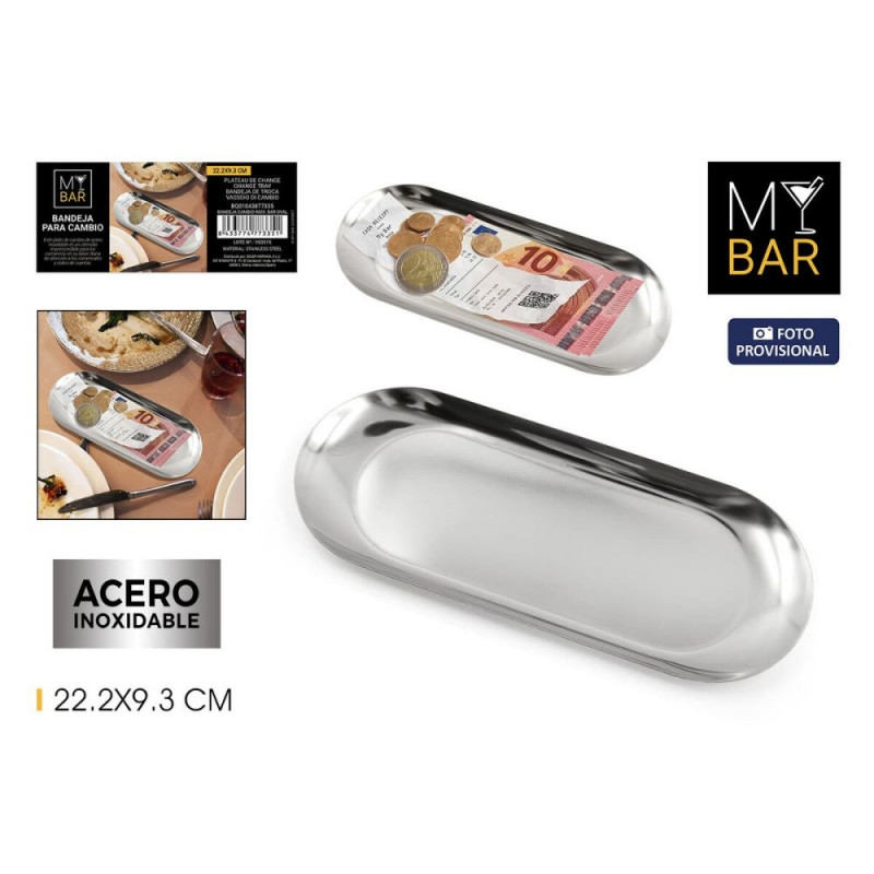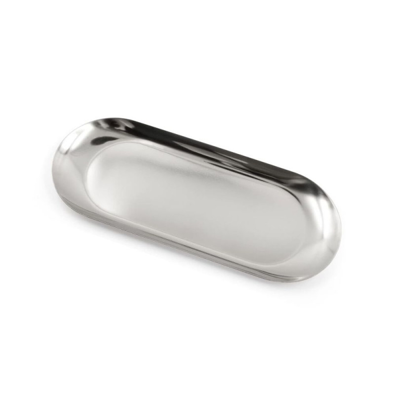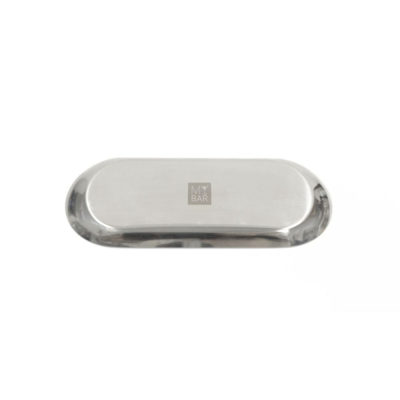 The My Bar tray is a professional accessory designed for bar environments, featuring a construction in stainless steel that ensures excellent corrosion resistance and durability against continuous use and exposure to liquids. Its oval shape is ergonomically adapted to facilitate the transport and presentation of drinks or utensils, optimizing the available space. Measuring 22.2 x 9.3 cm and weighing a light 100 grams, this tray combines functionality and maneuverability, comfortable for both industry professionals and home use at events. The quality stainless steel provides an elegant finish that is easy to clean, maintaining optimal hygiene during service. Its compact size makes it a versatile tool for serving cocktails, accompaniments, or small snacks without hassle. Overall, the My Bar tray is a practical and sturdy solution for those seeking a reliable and efficient complement in hospitality or social gatherings.