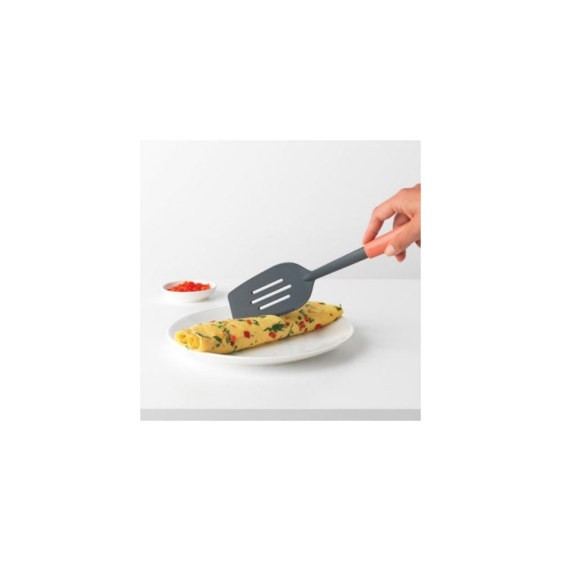 Eggs, meat, oven dish… Flip it, cut it and serve it with this Spatula plus Cutting Edge. Three tools in one, how's that for cutting the clutter in your kitchen drawer!Brabantia Tasty+. Product type: Cooking spatula, Product colour: Black, Terracotta,Warning: Last items in stock!