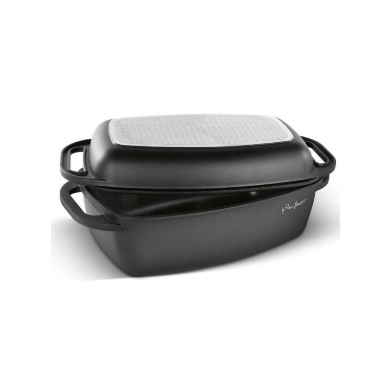 - Quality cast aluminium roasting pan with grilling lid and an inner non-stick surface resistant to burning, both dish and lid cookware feature a thick base