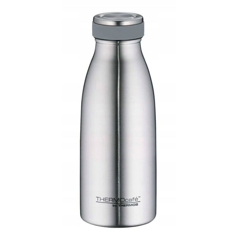 The THERMOS THERMOcafé thermos flask has a 350 ml capacity and is made of stainless steel. It keeps drinks cold for 24 hours and hot for 12 hours, and is leakproof and easy to clean.