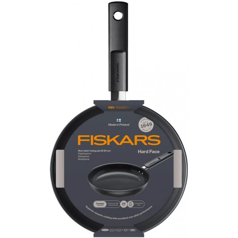 - Made in Finland, the Fiskars Hard Face 24 cm frying pan with a plastic-free and non-stick coating meets the requirements of even the most demanding home chef.