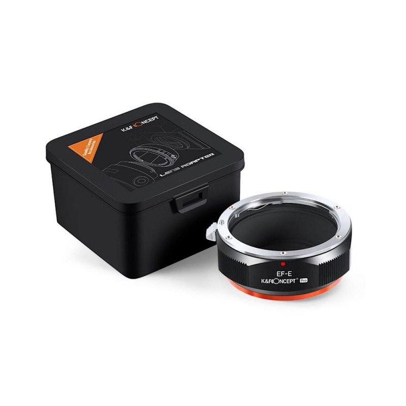The K&F Concept PRO adapter allows Canon EF lenses to be used with Sony E-mount cameras. It features a sturdy design, precise construction, and enables manual focus with an option for aperture priority mode.