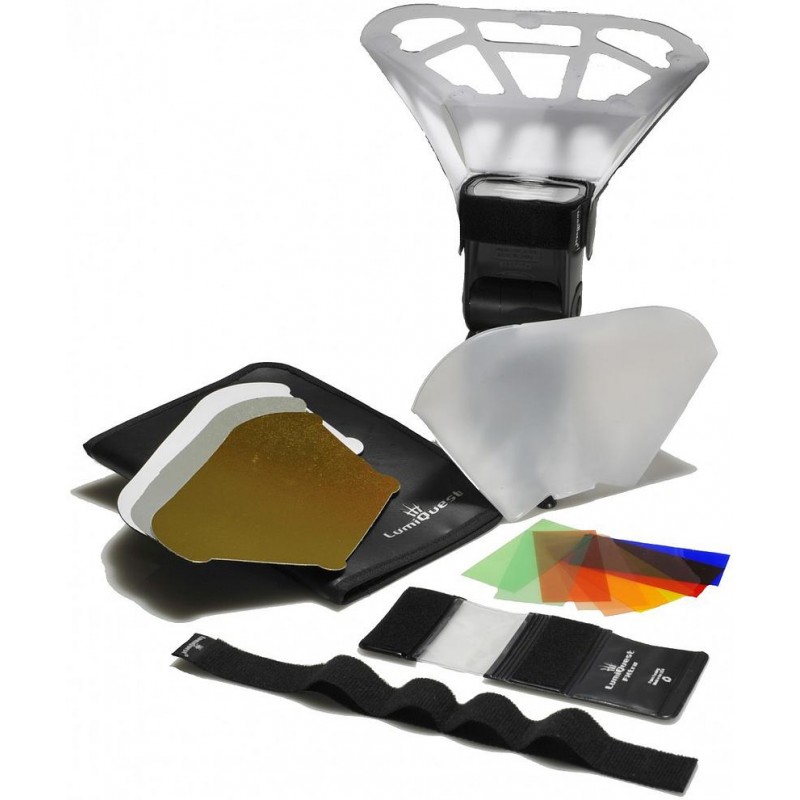 The Ready For Anything Kit from LumiQuest combines numerous light modifiers and accessories for a comprehensive kit of items to control and color the light emanating from your hot shoe flashProduct has been archived