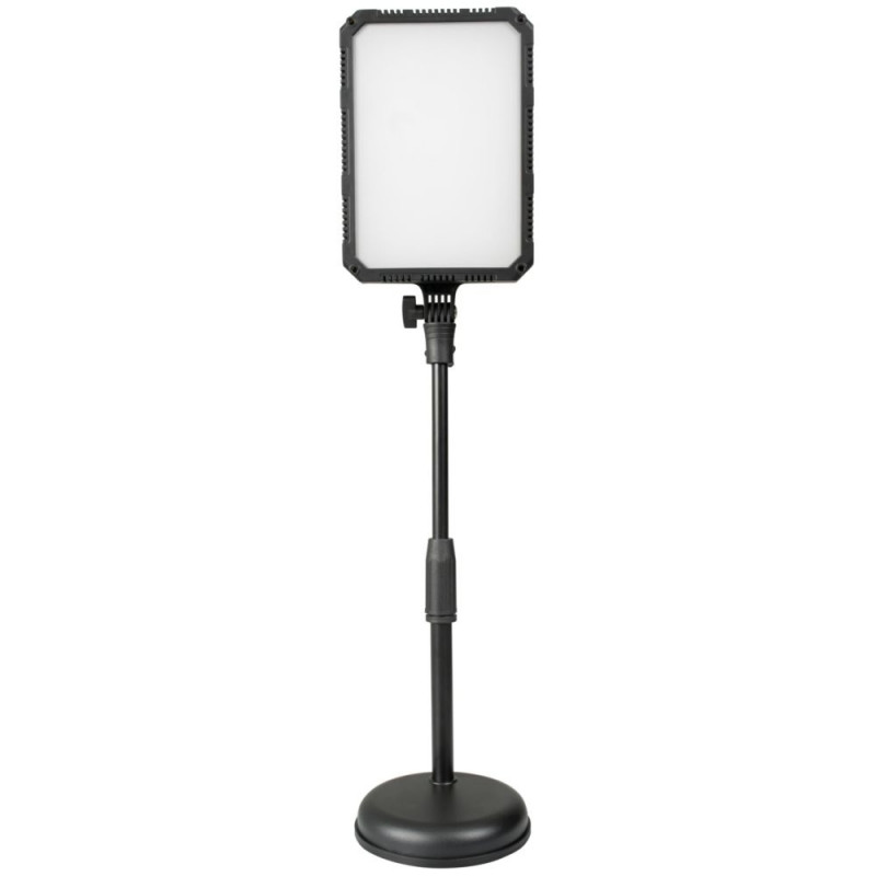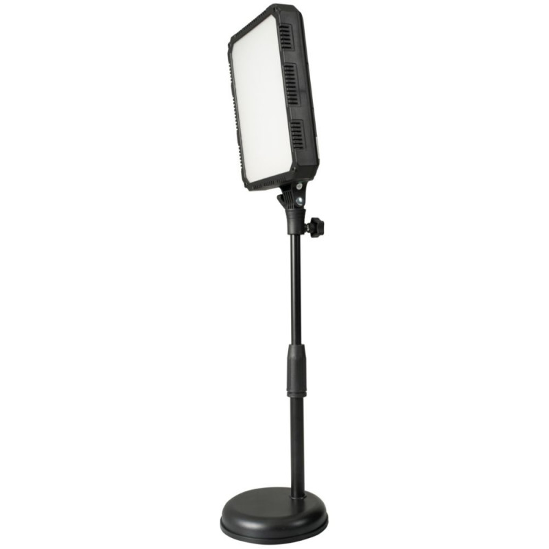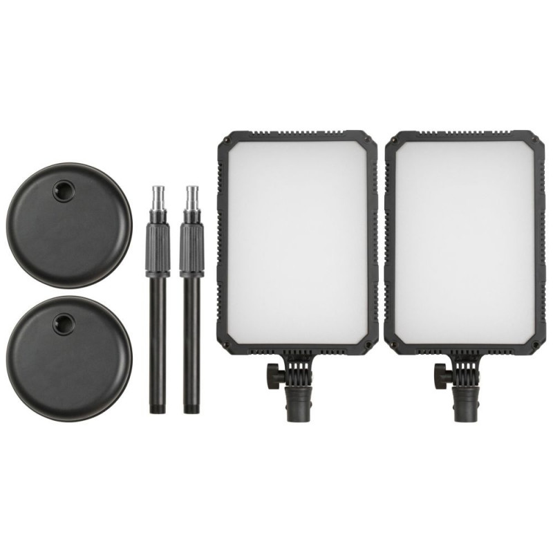 With two compact PL 24 Vario LED desktop lights with variable color temperature. For even and soft illumination with photo and video shots. Particularly suitable for portrait, interview, social media, vlogging, video conference, webinars, baby and children photography as well as still life, table top and macro shots. Dimmable. Mains operation. Each with height-adjustable desktop stand with round base.