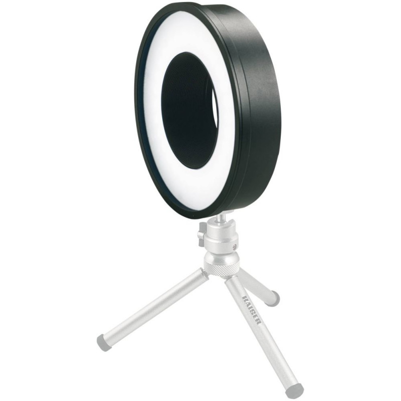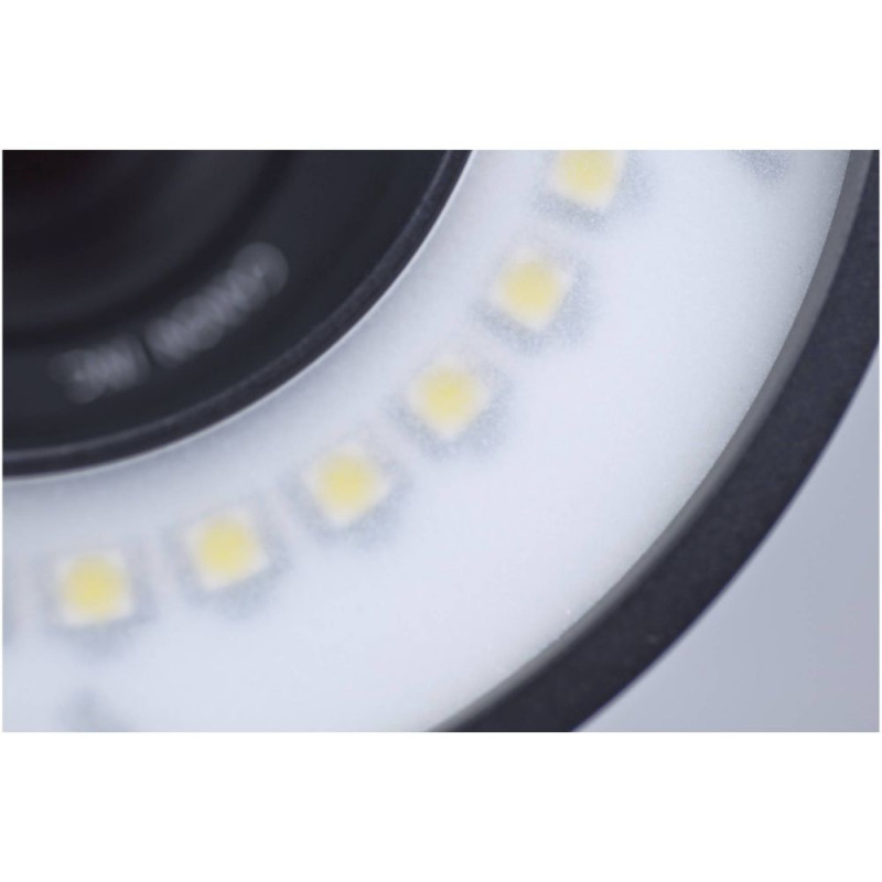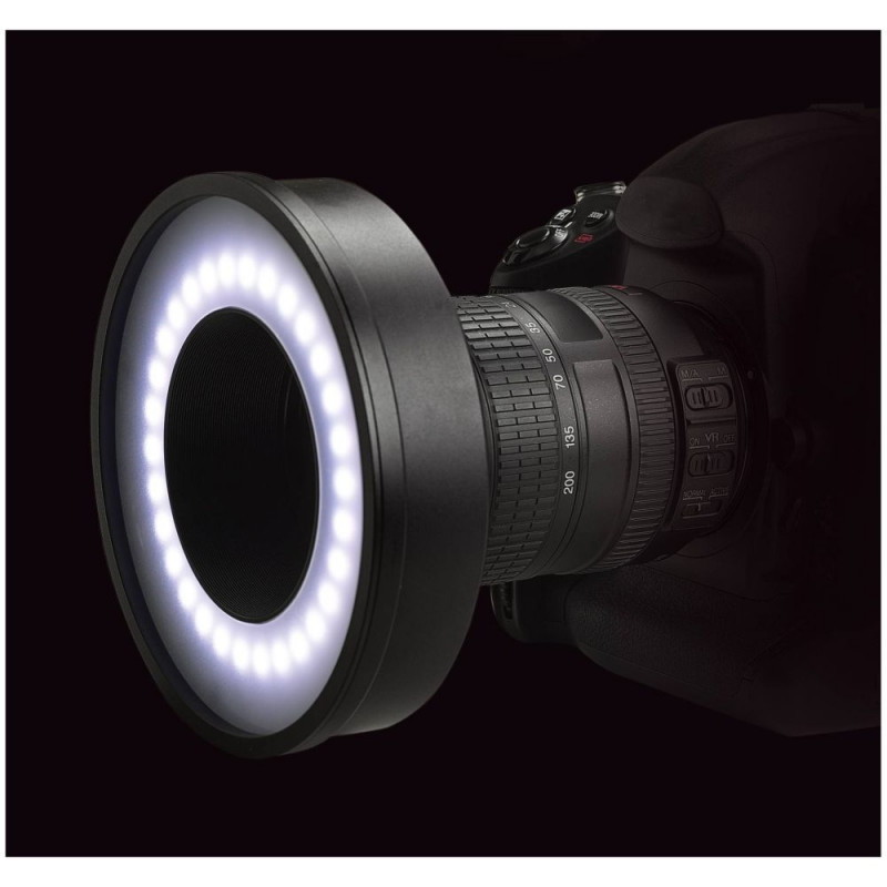 Professional ring light with 30 three-chip high performance LEDs. The light intensity corresponds to that of a 30 watt fluorescent light. extremely wide angle of radiation on 110°. A rechargeable lithium-ion battery and the complete circuitry are integrated in the main body made of highly durable duralumin. The light can be dimmed down to 50 %. The basic connection thread is 77 mm, several adapter rings from 55 to 72 mm are included. Light can also be mounted on a tripod. No light loss due to battery consumption. A quick charger is included. Tripod thread: 1/4"