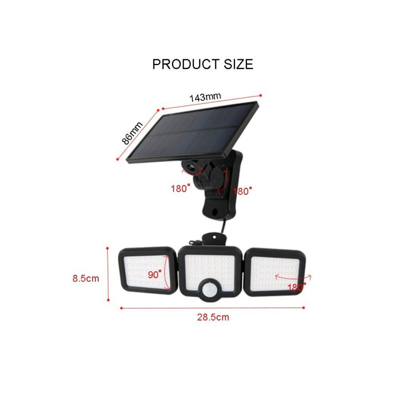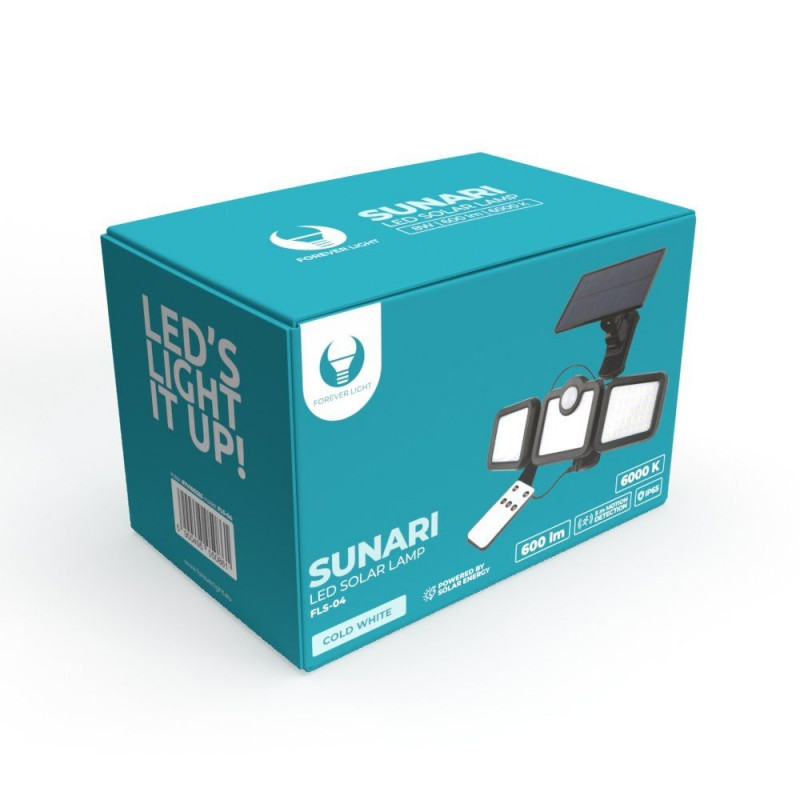 Forever Light Sunari FLS-04 solar lamp with PIR motion sensor, which has many functions and features that allow you to effectively illuminate various places, including front doors, sheds, gardens, balconies, facades, etc. The lamp has a high brightness of 600lm and high power of 8W, which allows it to provide good visibility and illuminate a larger area. Its IP65 rating makes it resistant to moisture and dust, allowing it to be placed outdoors. In addition, the lamp is equipped with a PIR motion sensor, which means that the light will be automatically turned on when motion is detected nearby, which is very convenient and saves energy. The lamp also has a capacious 2400mAh lithium-ion battery, which allows it to operate for 8-10 hours, depending on the battery charge. The lamp has three modes, which can be adjusted with the remote control. The first mode is 100% light from motion detection, the second mode is 100% light from motion detection + constant backlight 10%, and the third mode is constant light 50%. This allows you to adjust the brightness and mode of the lamp to suit your individual needs. In addition, the lamp consists of three separate lamps that can be directed in different directions, allowing you to illuminate a larger space. The solar panel is a separate module, connected to the lamp by a 5-meter cable, which allows you to place the lamp in a dark place and the panel in a sunnier one. The lamp has a modern and elegant design and is easy to install. It is ideal for those looking for functional and economical outdoor lighting.
