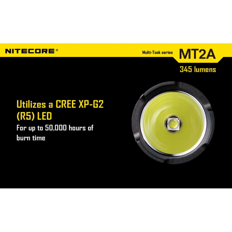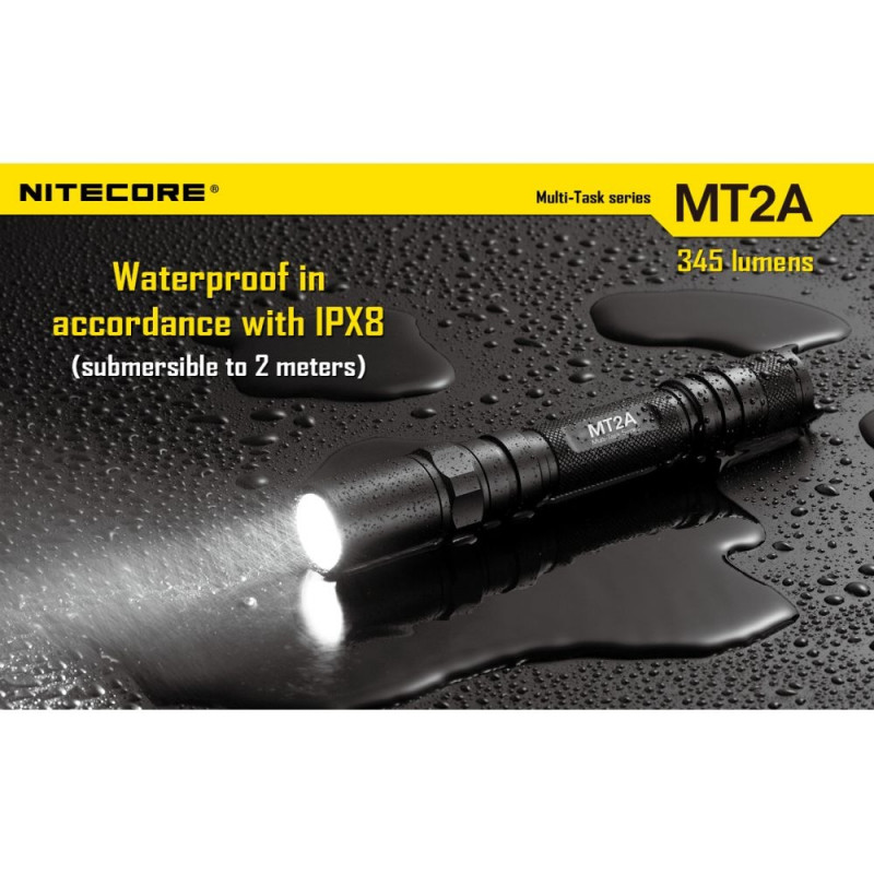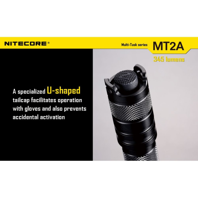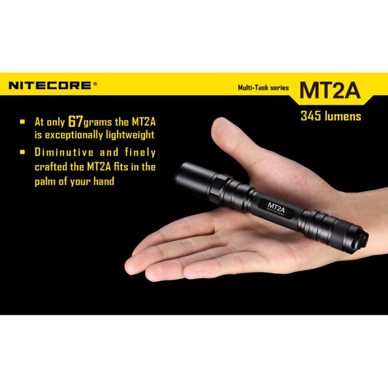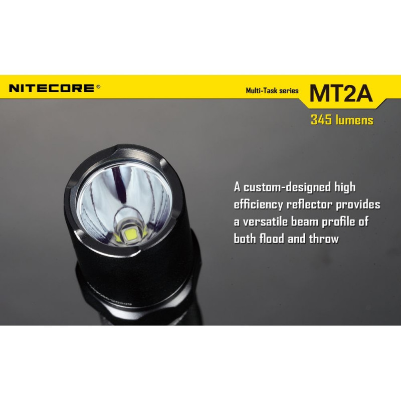 Spotlight - Nitecore Multi-Task Series MT2A Flashlight. Customize the flashlight according to your needs. The Nitecore MT2A flashlight is perfect for tactical operations or camping, as well as for home use. An easy-to-use interface allows quick access to Turbo mode or user-defined mode. With a built-in memory function, it can meet even the most diverse user needs. MT2A allows you to choose from 4 brightness levels - Low, Mid, High and Turbo. The device is extremely light and comfortable, but durable. It shines up to 345 lm and offers 4 brightness levels. You can easily save the settings - for example Turbo + Strobe or Turbo + Mid. Also offers 2 additional modes - SOS and Strobe.