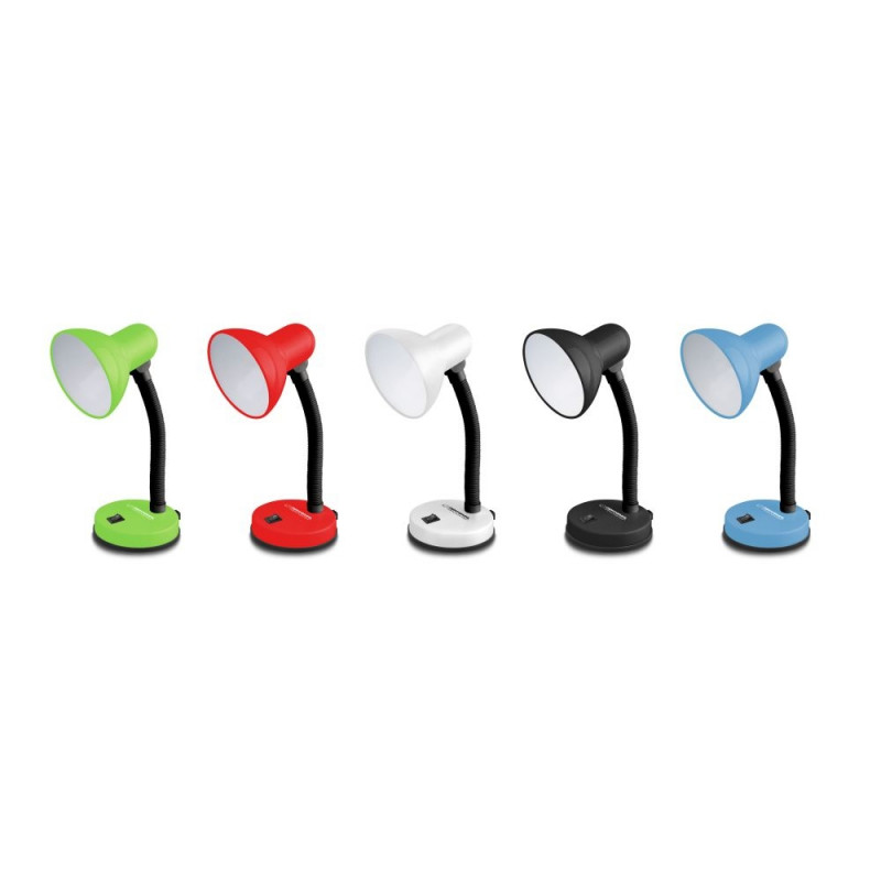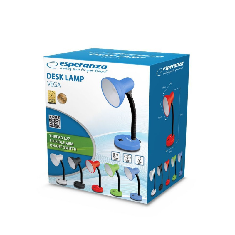 Klasyczna lampka biurkowa Esperanza VEGA z dużą, stabilną podstawką. Ruchome ramię umożliwia ustawienie lampki pod dowolnym kątem, co daje swobodę i komfort użytkowania. W lampce można instalować żarówki LED z gwintem E27 i mocą do 12 W.