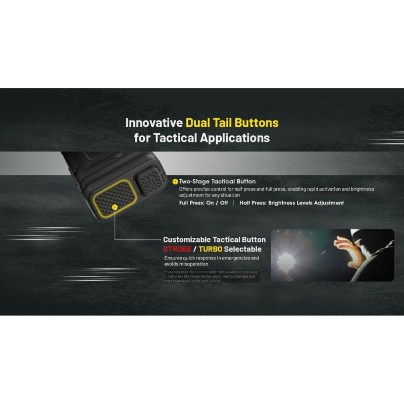 User-Friendly Design: Equipped with dual tail buttons for intuitive operation and a customizable button for quick access to Turbo or Strobe. It also has power and brightness level indicators.