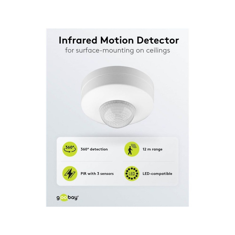 | Description | Never left in the dark again: The motion detector from Goobay prevents tripping hazards at dusk and in the dark, giving you a feeling of safety even at night. Perfect for corridors, bathrooms or hallways – the motion detector always reliably activates the |
