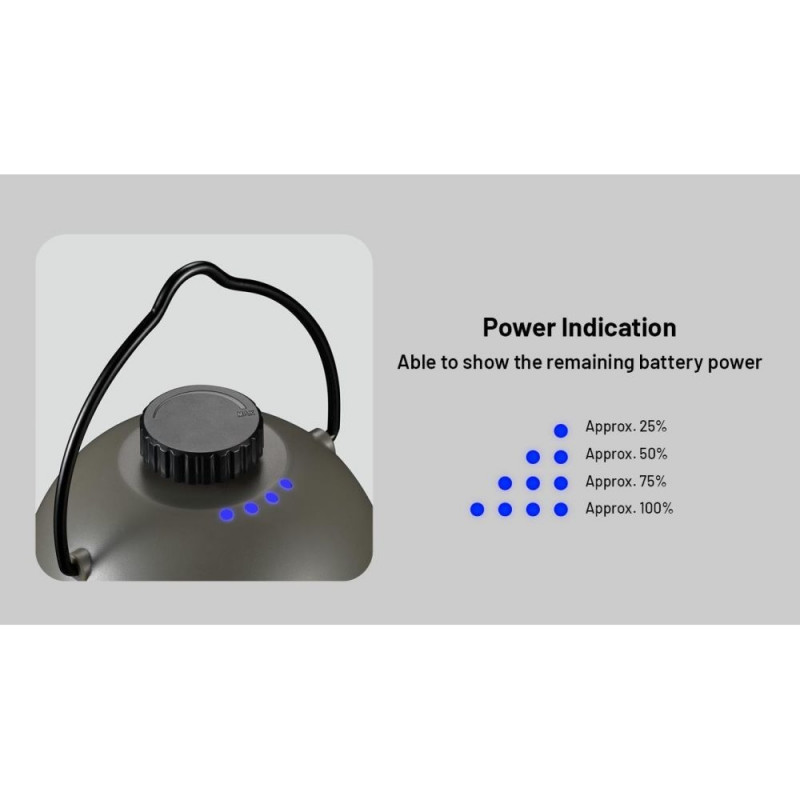 The Nitecore LR40 camping lantern has a maximum output of 100 lumens and is powered by a built-in 4000mAh li-ion battery which is rechargeable by USB-C. The warm and white outputs can be used independently or together, ensuring an output that will suit your camping set-up. All the outputs are operated by the single switch on top of the light, simply press and hold to turn the light on and off. Once on, a single press cycles through the modes and turning the dial will increase and lower the brightness level.In addition to the multiple outputs, the LR40 can be used as a power bank. Beside the USB-C port to recharge the light, sits a USB-A output port for keeping your electronic devices charged. The lamp has an LED power indicator next to the dial switch so you know when it's time to recharge.