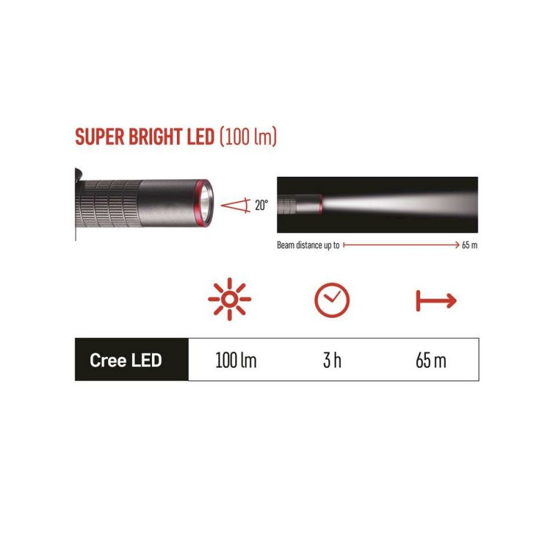 A compact LED flashlight designed for everyday use at home, work, or outdoors. The aluminum body provides durability and resistance to mechanical impact. The flashlight uses a CREE LED with a maximum light output of 100 lm and is powered by a single AAA battery. Its compact size and pocket clip make it convenient to carry.