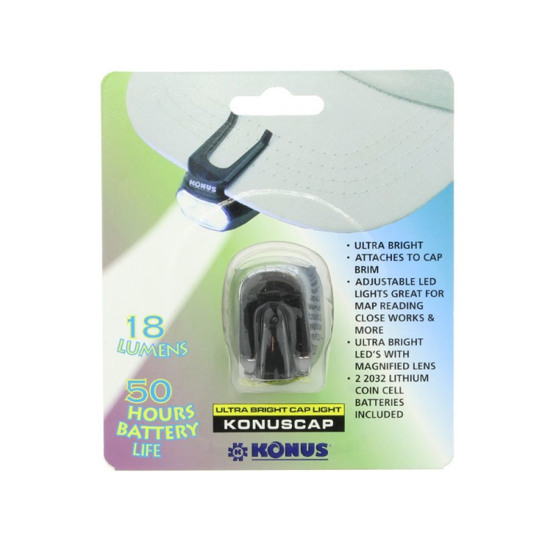The Konuscap is a clip-on light for your cap with three powerful LEDs that provide up to 18 Lumens. It offers hands-free lighting for about 50 hours with 2 CR2032 batteries included. Perfect for outdoor activities, repairs, and emergencies.Warning: Last items in stock!