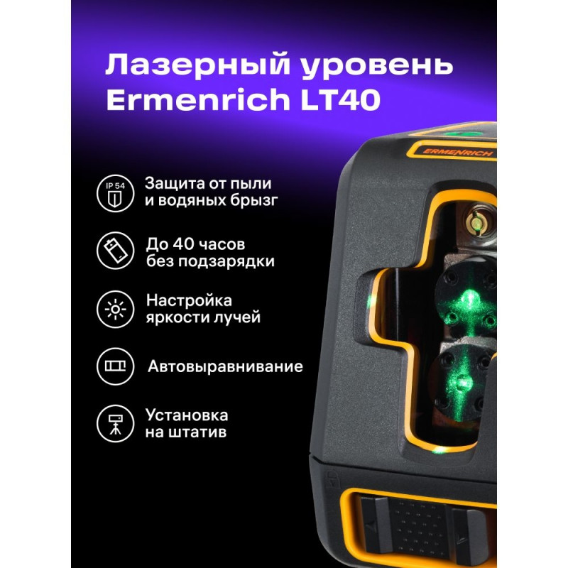 The Ermenrich LT40 is a laser level that generates two cross lines using green laser LEDs. The device is ideal for construction, interior design, and renovation work. Horizontal and vertical planes with a sweep of 130°. Powered by standard batteries, 10 levels of brightness are available. Even at maximum brightness, the battery run time is up to 10 hours on a single set of batteries, so you don’t need to replace them during your work shift.