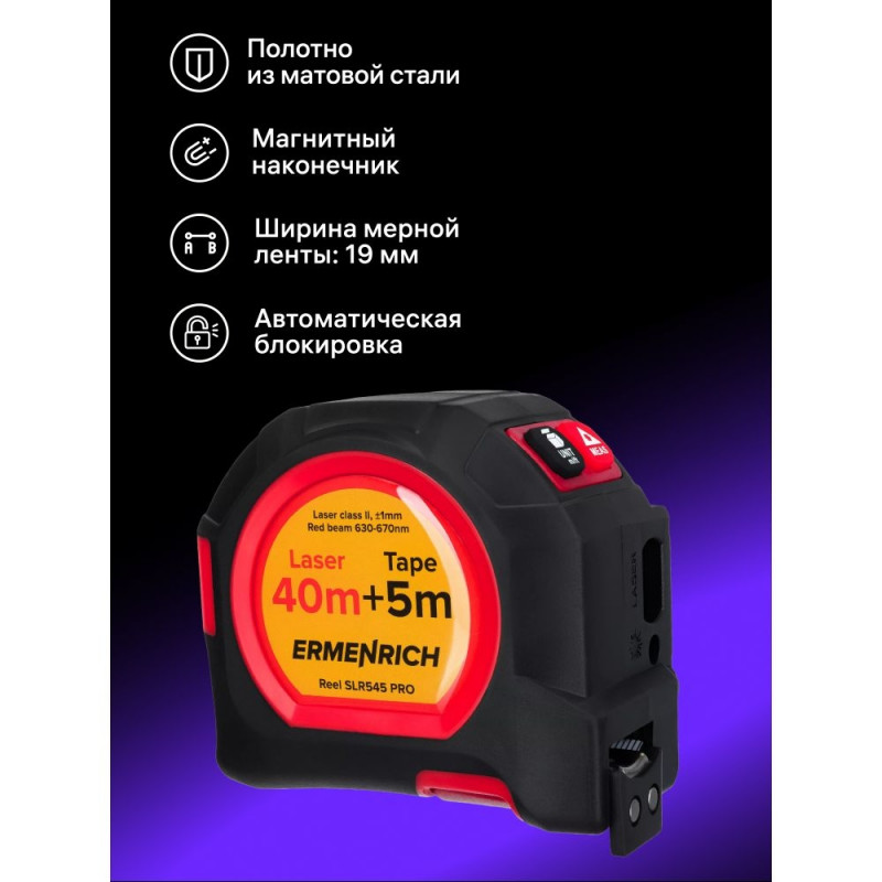 The measuring range of the laser is 40 meters, and it can be used for a variety of applications in city apartments and country houses. As for the tape measure itself, it is single-sided, 5 meters long, and has a magnetic hook. The self-locking mechanism makes it quick and easy to use the device. The compact case of the Ermenrich Reel SLR545 PRO laser meter is made of high-strength ABS plastic and has a rubberized surface. The belt clip enables you to easily attach the laser meter to your clothing for hands-free operation.