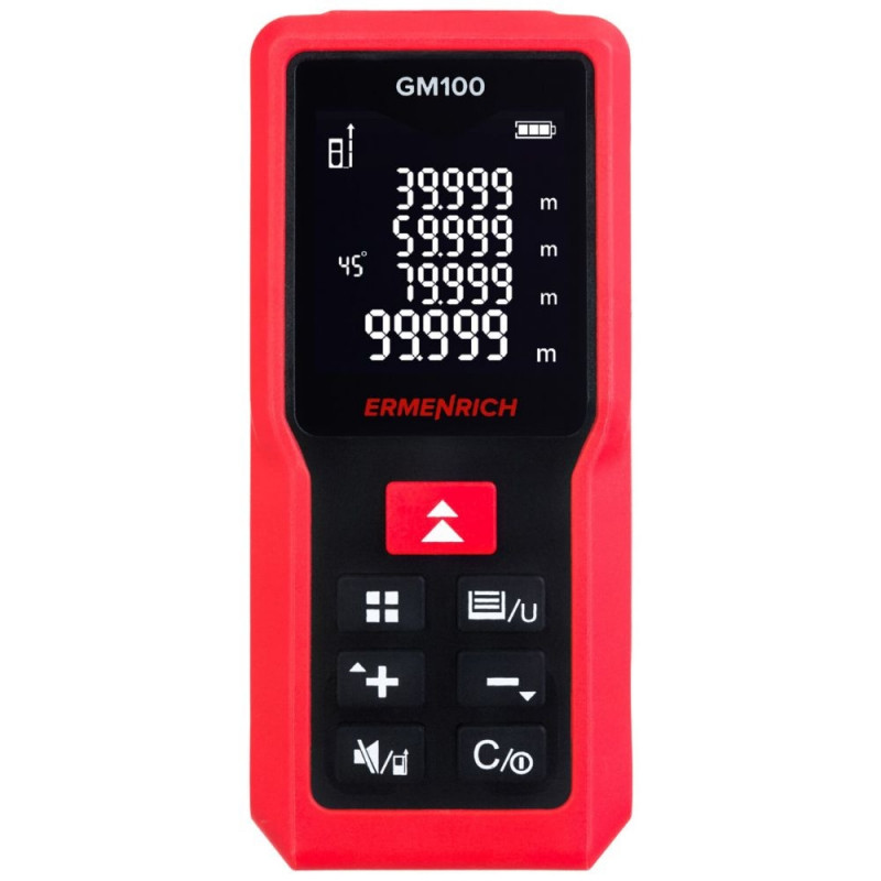 The Ermenrich Reel GM100 is a laser measuring device that was developed for measurements on construction sites for new buildings or renovations. It can also be used for property line surveying, surveying work, and other applications that require precise measurement of an object's linear dimensions, area, and volume. The maximum measuring distance is 100 meters. The laser measuring device can also be used as a laser protractor. Thanks to the Pythagorean theorem function, it automatically calculates distances after taking intermediate measurements. This feature is especially useful when you cannot position the laser to draw the beam directly from point to point.
