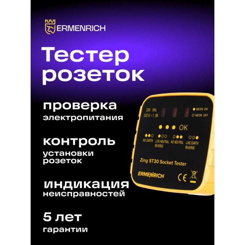 The Ermenrich Zing ST30 Socket Tester is designed to test whether all of the sockets are properly wired and to check the voltage. The tester must be plugged directly into a socket, and the LED’s flashing will indicate various electrical faults: no ground/no neutral, live/neutral reverse, or live/ground reverse. In addition, the specific color code that appears on the tester screen signals the correct wiring condition. The function of each code is written on the device.