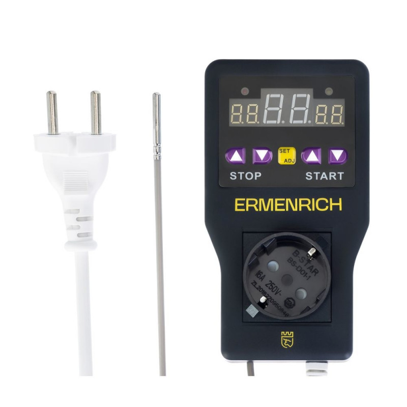 An NTC sensor on a 1 meter long cable is used to read the temperature. Measuring range: −9 to +99°C, measurement accuracy ±1°C. The temperature controller allows you to control heating and cooling. It also has a time control function to set it to turn on and off on a timer or at specified intervals. When high temperatures are reached, the controller gives a light signal.