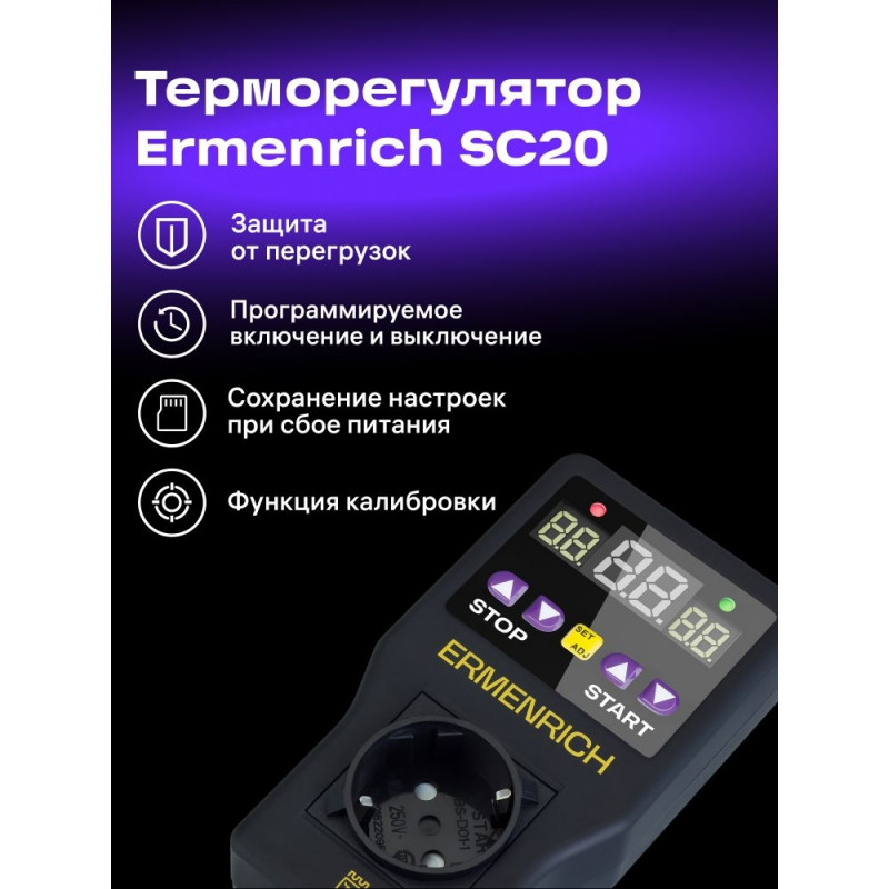 The Ermenrich SC20 microprocessor-based temperature controller allows you to control the temperature on any type of premises – residential, office, industrial, farms, and greenhouses. You can connect it to heating appliances, air conditioners, water heating systems, etc. The controller sensor reads the ambient temperature. When the temperature reaches the desired level, it either turns on the device connected to it or turns it off, thereby maintaining the desired temperature.