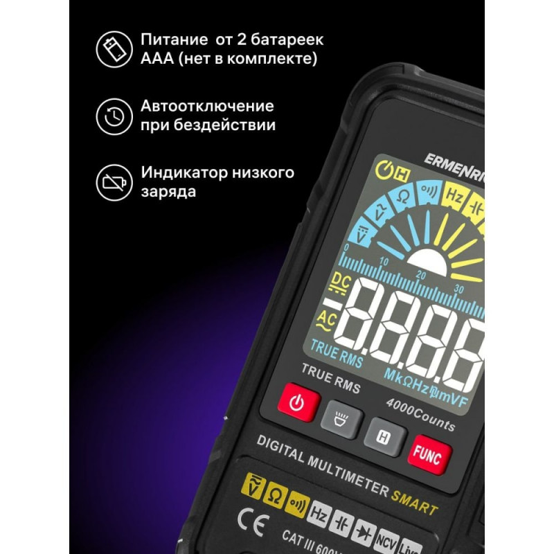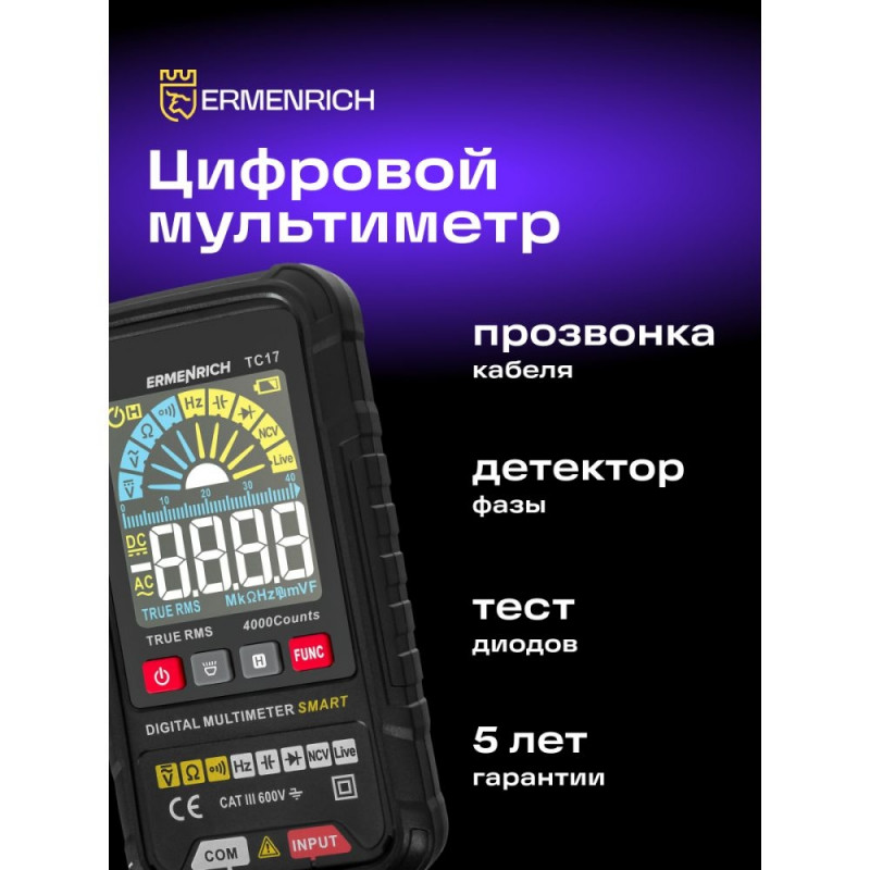 The Ermenrich Zing TC17 digital multimeter is an accurate (True RMS) and compact measuring device for technicians and handymen. It is suitable for the diagnostics of electrical networks in apartments, country houses, industrial facilities, office premises, and cars as well as for troubleshooting electrical devices. The multimeter fits in your pocket, and so it is convenient to carry with you even when working on large sites.