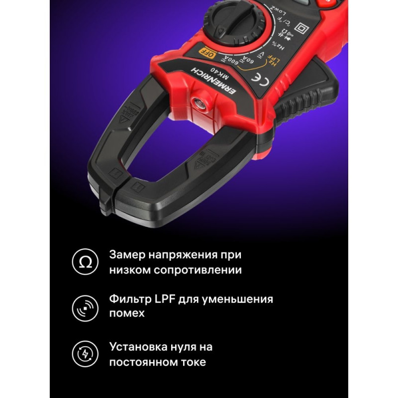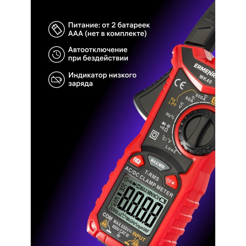 The Ermenrich Ping MK40 digital clamp meter measures not only alternating current but also direct current as well as 6 other parameters: voltage (direct and alternating), resistance, frequency, capacitance, duty cycle, and temperature. There is also additional functionality that will be enough for these current clamps to become the user’s only device for solving the problems of both household and professional use.