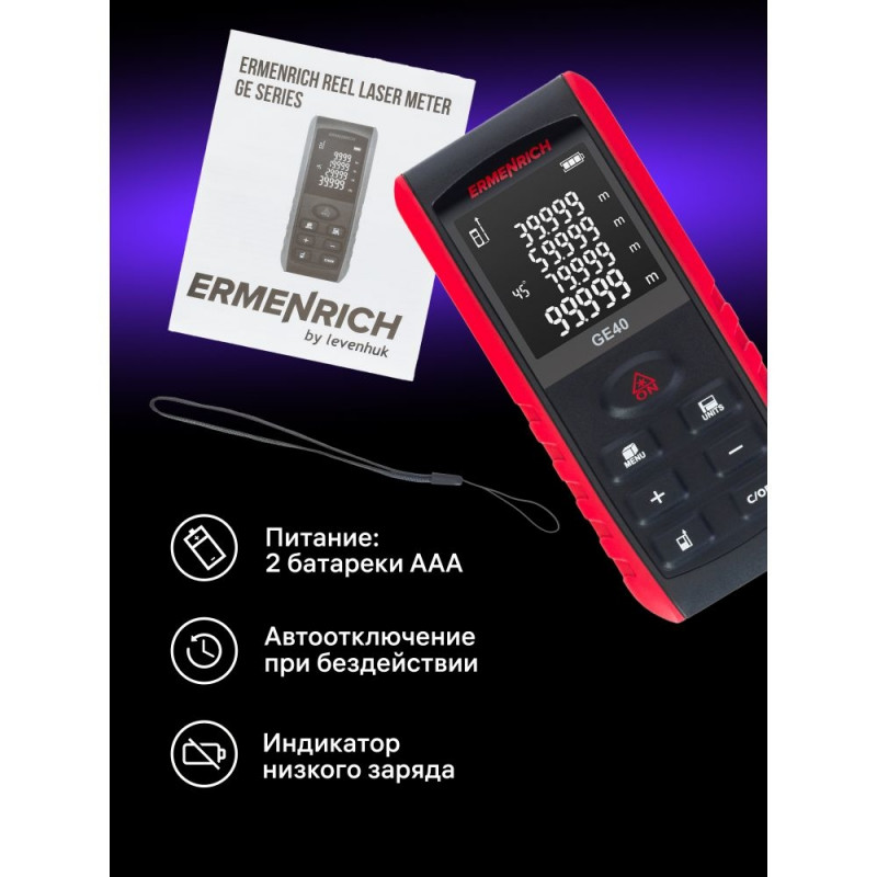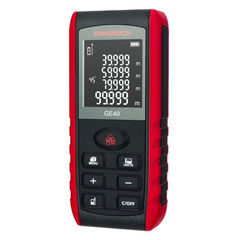 The Ermenrich Reel GE40 laser meter is a practical, multifunctional tool for construction, repair, and engineering work. With its help, you can measure distances within 40 meters (130ft) as well as calculate area, volume, and angles. When you need to take measurements under difficult conditions, the Pythagorean theorem feature will help calculate the distance from intermediate measurements.