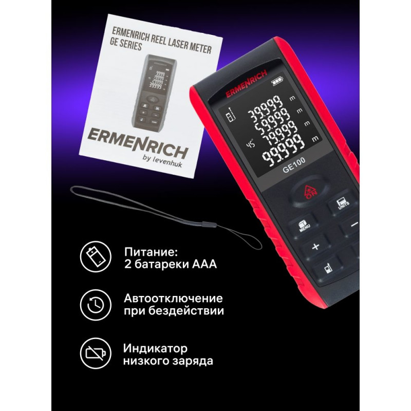 The Ermenrich Reel GE100 laser meter is a compact device designed for various tasks in construction, repair, and everyday life. It enables you to determine the distance from point to point with an accuracy of within 2 millimeters as well as to calculate area, volume, and measure the angles of objects. The meter also has the Pythagorean theorem feature – calculating distances using intermediate measurements. This is convenient when it is impossible to put the meter at the desired point or if there is an obstacle in the path of the beam.