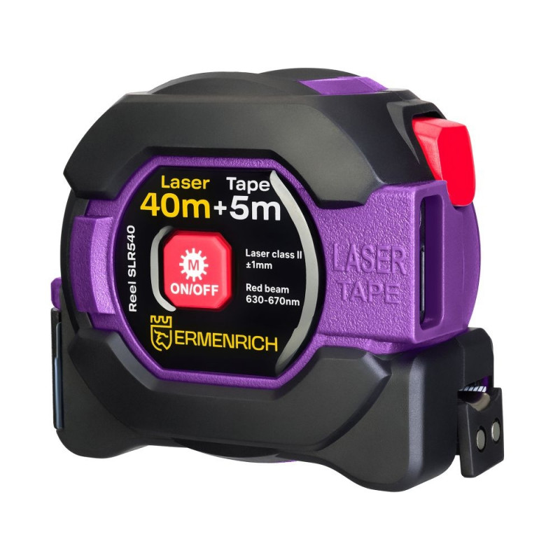 Laser Tape Measure Ermenrich Reel SLR540 is a multi-purpose tool designed for all kinds of construction, installation, repair, and finishing works of various complexity. The model combines a laser meter with a standard metal tape measure. It is all you need for the precise measurement of distance as well as the dimensions of long building materials. For your convenience, you can select the units of measurement and save the results in the memory of the device.