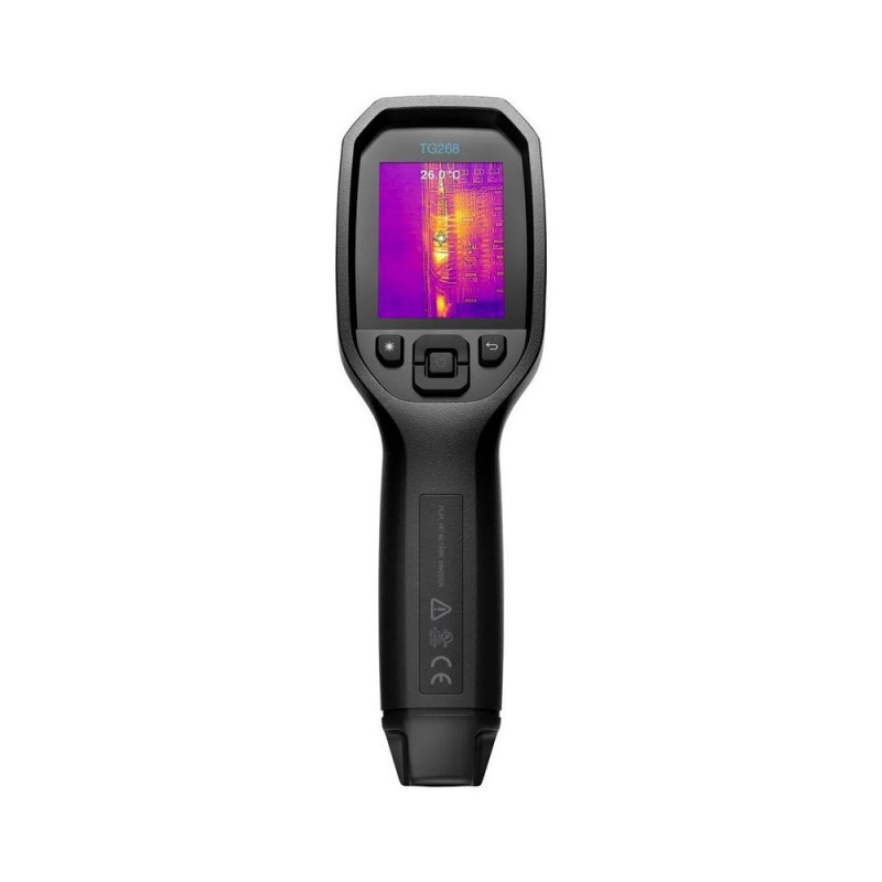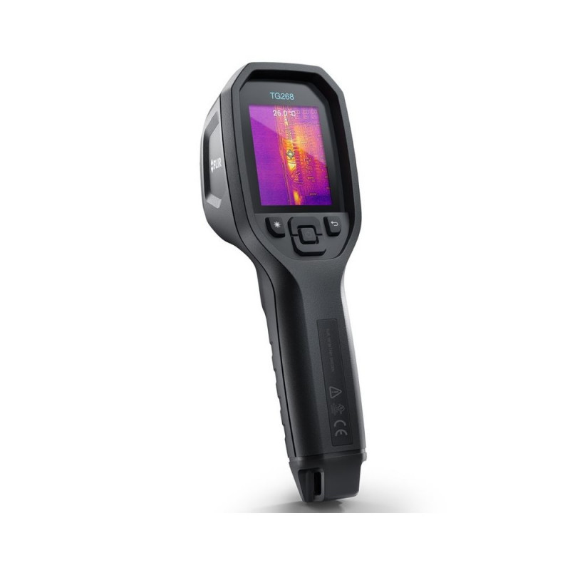 The FLIR TG268 Infrared Thermometer measures temperatures from -25 to 400°C and features a built-in LCD display with a resolution of 320 x 240 pixels. It includes Bluetooth connectivity, a built-in laser pointer, flashlight, and has an IP54 rating for protection against dust and water.