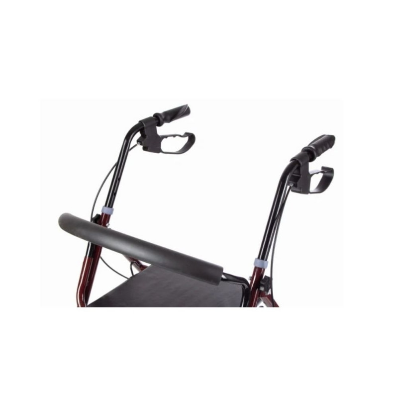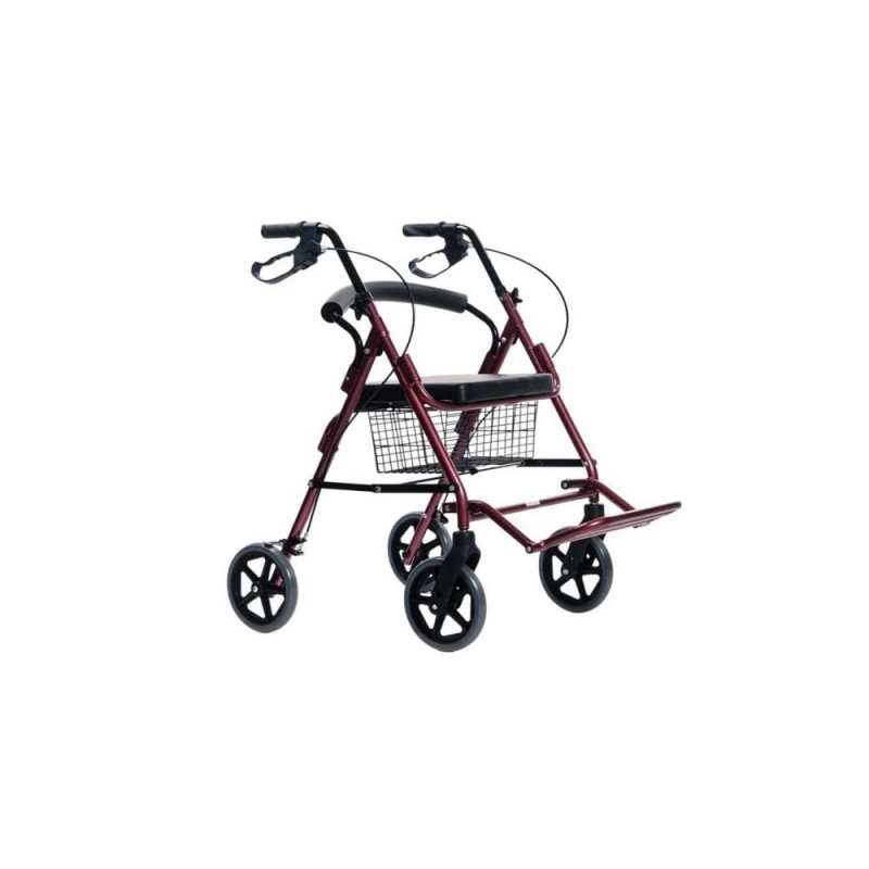 Four-wheel walker has a maximum load capacity of 120 kg and features a foldable design with adjustable height. It includes an ergonomic seat, lockable wheels, and a storage box for convenience.Warning: Last items in stock!