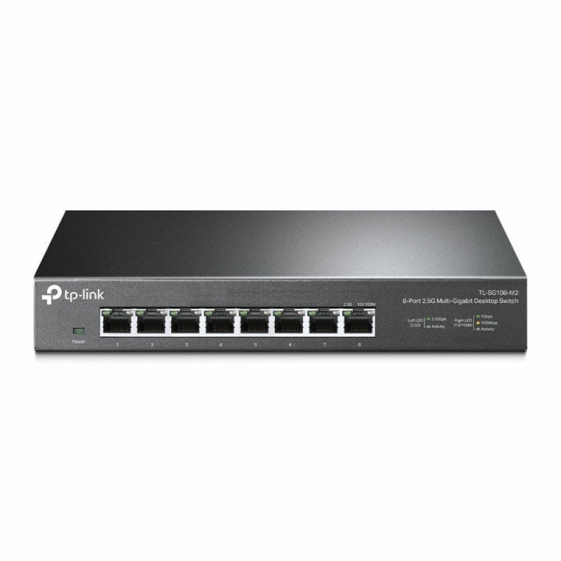The TP-Link TL-SG108-M2 is an unmanaged switch designed to provide an effective and simple connection solution for local networks requiring high performance and stability. Equipped with 8 RJ45 ports supporting 2.5G Ethernet speeds (compatible with 100/1000/2500 Mbps), it optimizes data transfer and reduces bottlenecks in home or small office environments. Its compact and sturdy black metal housing ensures durability and good heat dissipation, ideal for fixed installation, including wall mounting to facilitate integration in various spaces. With a switching capacity of 40 Gbit/s and a MAC address table of up to 16,000 entries, this model delivers stable performance for multiple simultaneous devices, ensuring smooth and efficient connectivity. It also complies with network standards IEEE 802.3, 802.3u, 802.3ab, 802.3bz, 802.3p, and 802.3x, guaranteeing compatibility with most current Ethernet equipment and essential features like flow control to prevent packet loss. Powered by 12 V and 220 V, it is compatible with standard electrical environments, allowing hassle-free setup. Overall, the TL-SG108-M2 is a practical and reliable choice for those needing to expand or improve their network infrastructure with a simple device that requires no advanced configuration, maintaining high speed and stability in wired Ethernet connections.