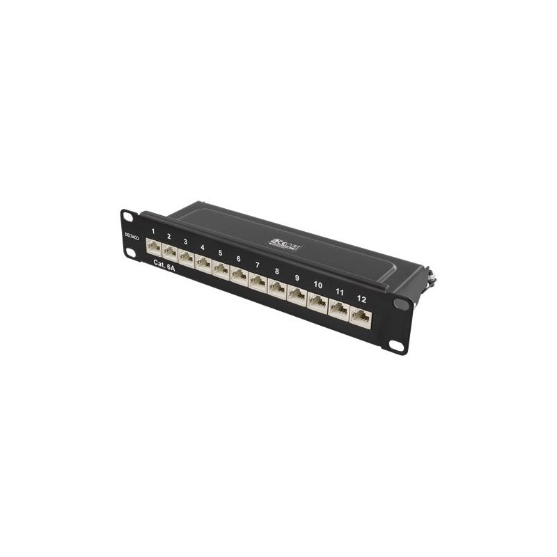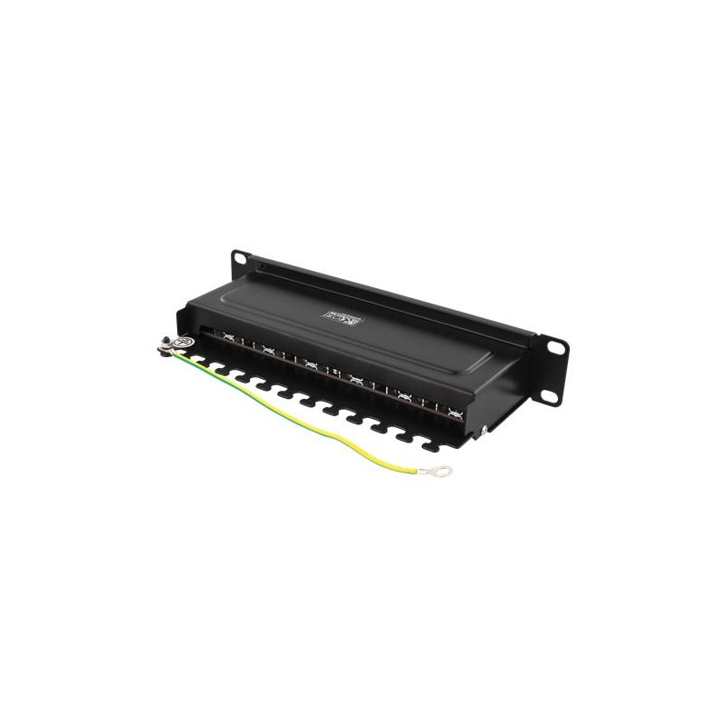 Shielded patch panel with 12 RJ45 ports made for installation in 10" racks. On the back is a cover that can be easily screwed on and off to protect the krone terminals and cables. The cables can also be screwed into place for a secure installation. DProduct has been archived