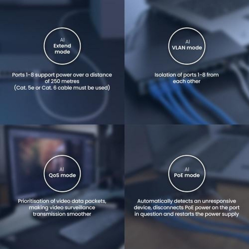Extralink CERES (switch extralink ceres ex3906 8x) is a 10-port PoE switch with 4 modes of operation: AI QoS, AI VLAN, AI Exten and smart power mode. The AI QoS mode is ideal for use in monitoring, ensuring smooth image quality by processing video daProduct has been archived