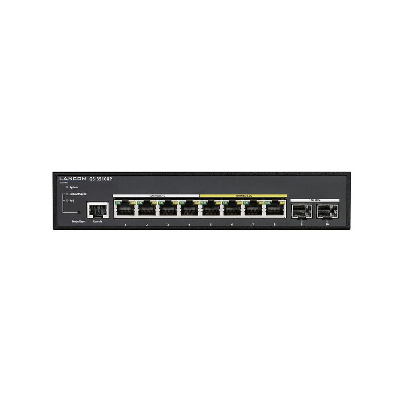 "LANCOM GS-3510XP. Switch-Typ: Managed, Switch-Ebene: L2. Basic Switching RJ-45 Ethernet Ports-Typ: 2.5G Ethernet (100/1000/2500), Anzahl der basisschaltenden RJ-45 Ethernet Ports: 4, Konsolen-Port: RJ-45. MAC-Adressentabelle: 16000 Eintragungen, Routing-/Switching-Kapazität: 68 Gbit/s. Netzstandard: IEEE 802.1AX, IEEE 802.1D, IEEE 802.1Q, IEEE 802.1ab, IEEE 802.1ad, IEEE 802.1ak, IEEE 802.1p,.... Netzstecker: AC-Eingangsbuchse. Power over Ethernet (PoE). Rack-Einbau, Formfaktor: 1U"