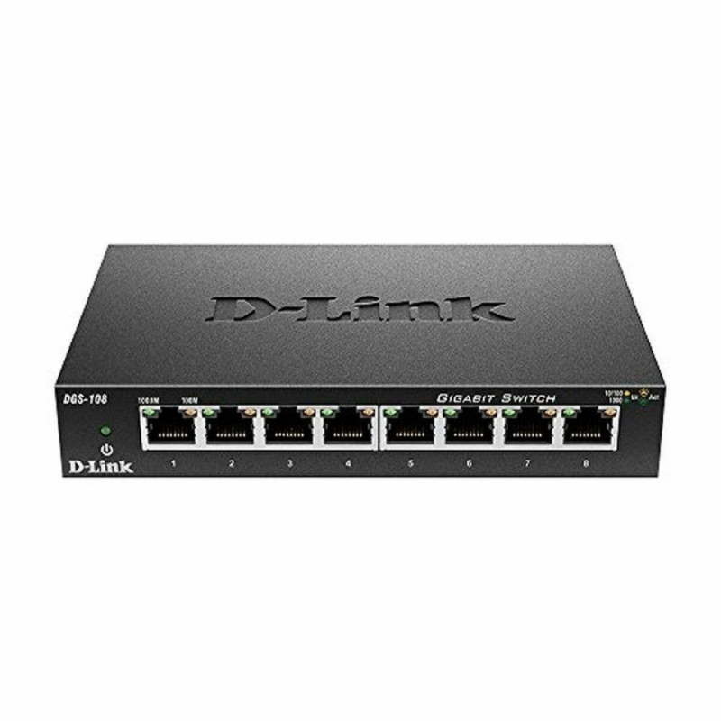 The DGS-108 switch from D-Link is an unmanaged network device designed for home and small business environments that require a compact and efficient solution to manage Ethernet connections. This desktop switch features 8 RJ45 gigabit ports (10/100/1000 Mbps), providing fast and stable connectivity for multiple devices simultaneously, enabling high-bandwidth local data transfer. It supports IGMP Snooping, a key feature to improve performance on networks streaming IPTV by limiting multicast traffic only to the receiving device, thus avoiding congestion and performance degradation on other devices, especially on Wi-Fi networks. The black metal casing offers durability and effective heat dissipation, keeping the device in optimal conditions. Its compact design of 162 x 102 x 28 mm makes it easy to place on desks or shelves, and its Energy Efficient Ethernet (EEE) technology reduces power consumption by adjusting energy use based on cable length, ensuring efficient operation with a maximum consumption of 2.8 watts. The DGS-108 includes an 8K-entry MAC address table, supports auto-negotiation and auto MDI/MDIX to simplify connections without crossover cables, and handles jumbo frames up to 9000 bytes, optimizing large file transfers. It also features per-port LED indicators showing link status, activity, and speed, facilitating visual network monitoring. Its excellent MTBF of over 2 million hours guarantees reliability and long service life, while complying with multiple international certifications (FCC, CE, RoHS, among others) to ensure quality and safety standards. Suitable for upgrading network infrastructure with a balance of performance, efficiency, and ease of use, the DGS-108 is a practical technical solution for home users and SMEs seeking a solid and simple gigabit switch.