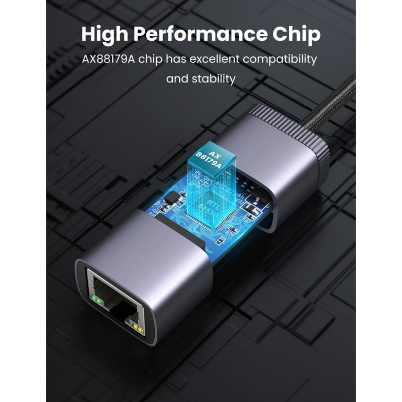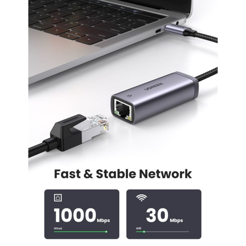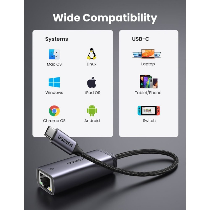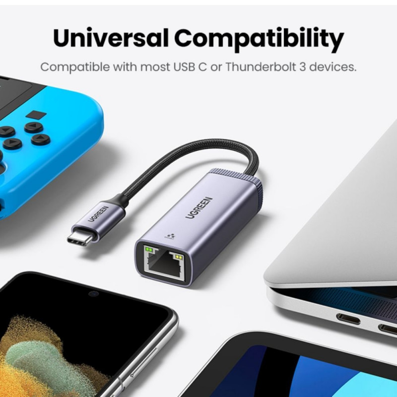- Plug and play, turns a USB-C port into an RJ45 Ethernet Gigabit port