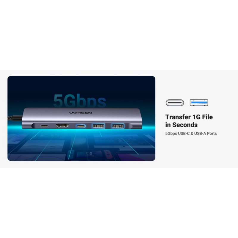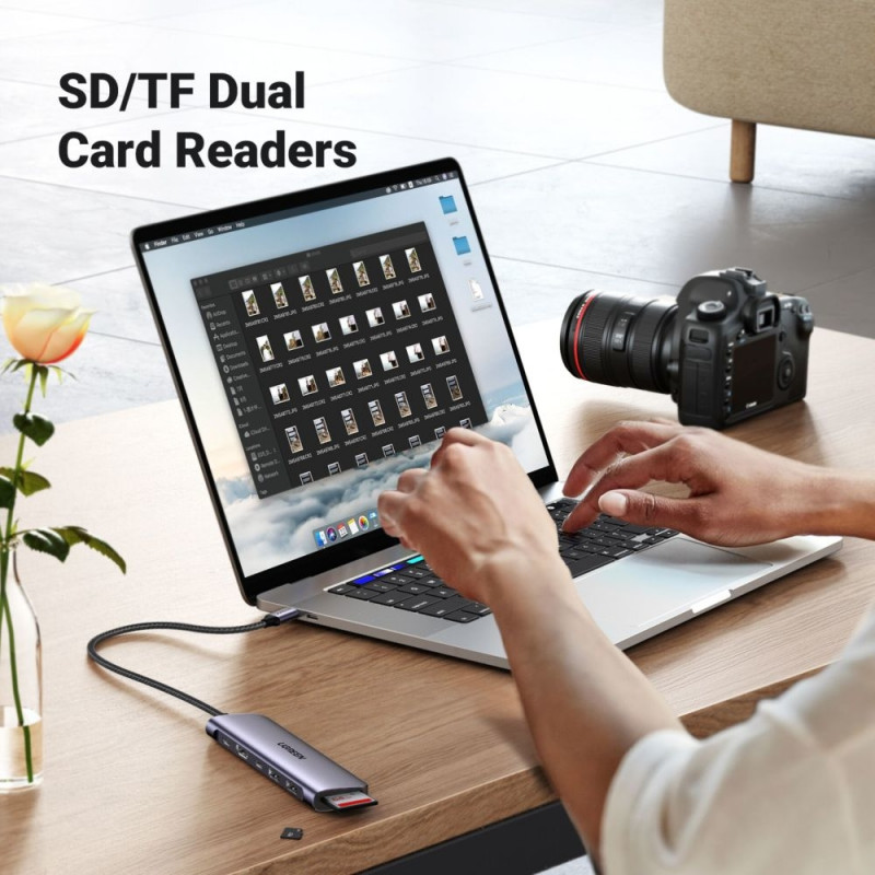 All in one: The UGREEN USB-C Multiport Hub turns a USB-C port into 7 ports incl. 1x 4K@30Hz HDMI port, 2x USB-A 3.0, 1x USB-C 3.0, SD + MicroSD card slot and 1x 100W USB C PD port.