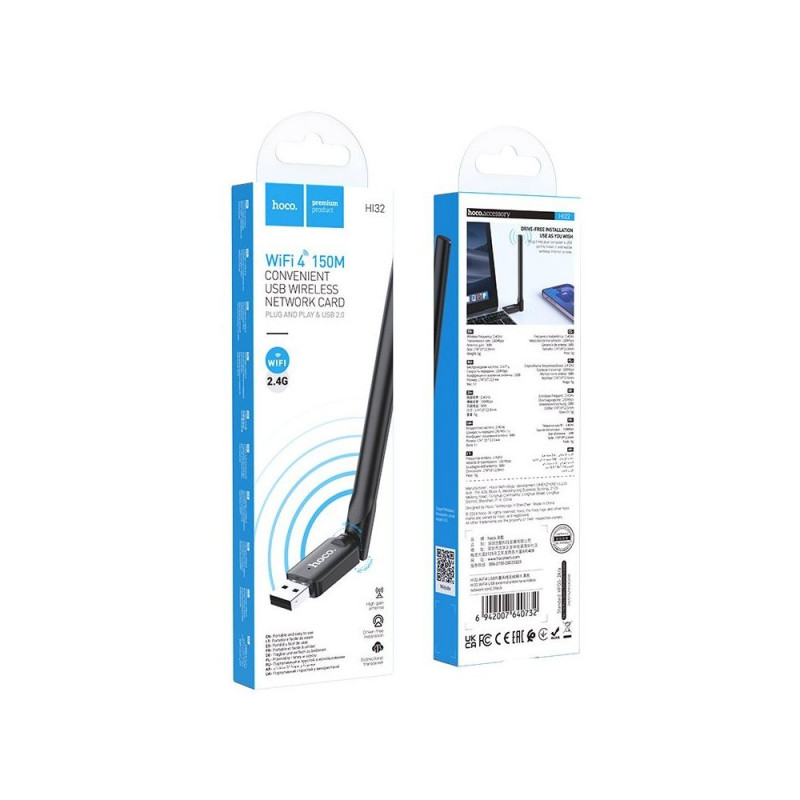 HOCO HI32 is a compact network card that enables a fast and stable connection to a wireless network. It supports the Wi-Fi 4 (IEEE802.11b/g/n) standard and work at 2.4 GHz frequencies, providing data transmission at speeds of up to 150 Mb/s. It works perfectly in laptops and desktop computers, ensuring convenient use of the Internet.