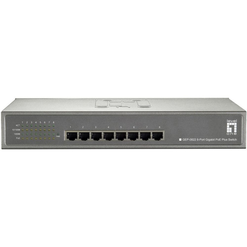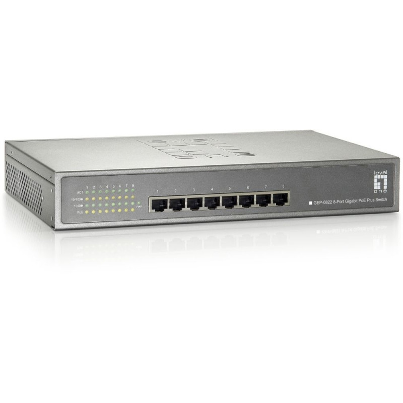 "LevelOne GEP-0822. Basic Switching RJ-45 Ethernet Ports-Typ: Gigabit Ethernet (10/100/1000), Anzahl der basisschaltenden RJ-45 Ethernet Ports: 8. MAC-Adressentabelle: 8192 Eintragungen, Routing-/Switching-Kapazität: 16 Gbit/s. Netzstandard: IEEE 802.3, IEEE 802.3ab, IEEE 802.3af, IEEE 802.3at, IEEE 802.3az, IEEE 802.3u, IEEE 802.3x. Power over Ethernet (PoE). Rack-Einbau"