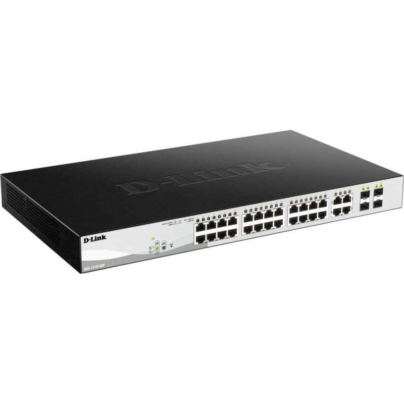 "D-Link DGS-1210-28P. Switch-Typ: Managed, Switch-Ebene: L2. Basic Switching RJ-45 Ethernet Ports-Typ: Gigabit Ethernet (10/100/1000), Anzahl der basisschaltenden RJ-45 Ethernet Ports: 28. Vollduplex. MAC-Adressentabelle: 16000 Eintragungen, Routing-/Switching-Kapazität: 56 Gbit/s. Netzstandard: IEEE 802.3, IEEE 802.3ab, IEEE 802.3af, IEEE 802.3at, IEEE 802.3u, IEEE 802.3x. Power over Ethernet (PoE). Rack-Einbau, Formfaktor: 1U"
