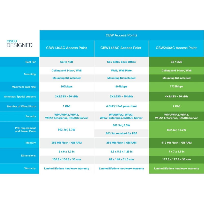 "Cisco CBW240AC. 2,4 GHz, 5 GHz, Maximale Datenübertragungsrate: 1733 Mbit/s. Unterstützte Sicherheitsalgorithmen: WPA, WPA2, WPA3, WPA2-Enterprise. Ethernet LAN Datentransferraten: 10,100,1000 Mbit/s. Power over Ethernet (PoE). Produktfarbe: Grau"