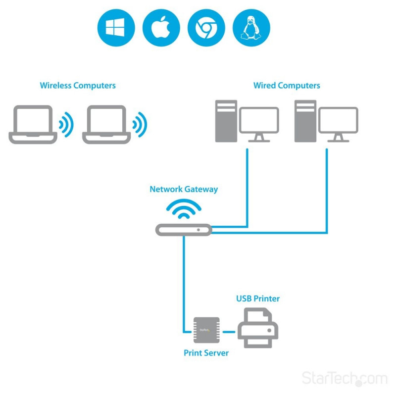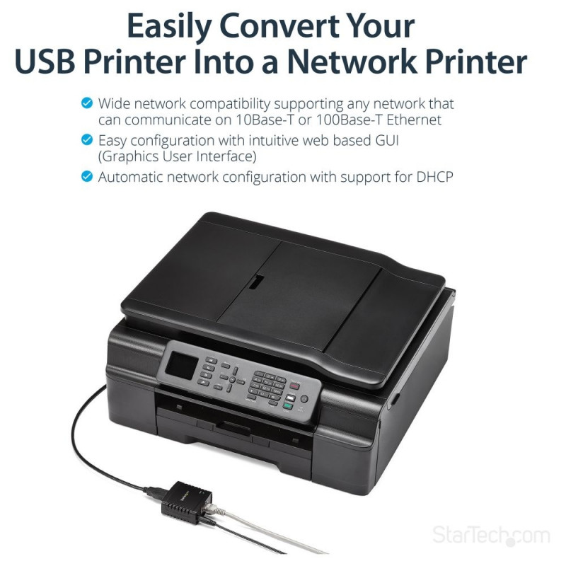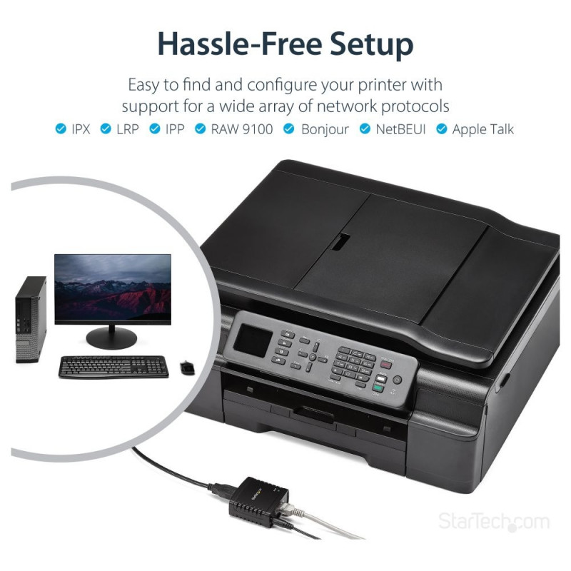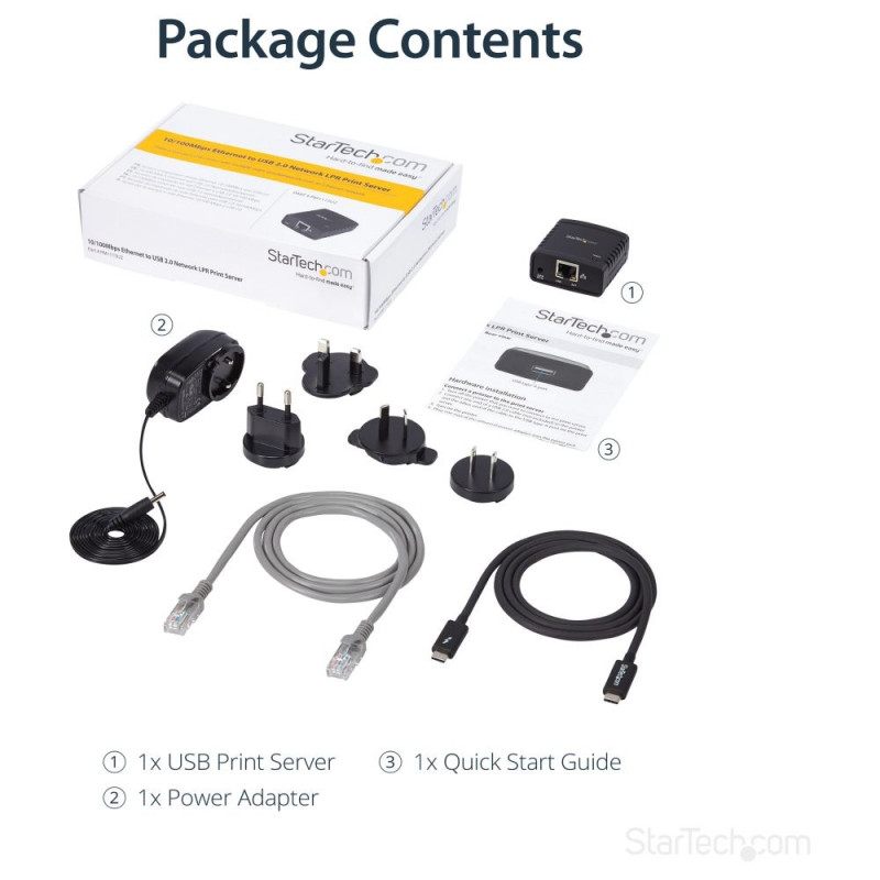"StarTech.com 10/100 Mbit/s Ethernet auf USB 2.0 Netzwerk LPR Printserver. Produktfarbe: Schwarz, LED-Anzeigen: Aktivität, Link, Leistung. Network Connection Typ: Ethernet-LAN, Netzstandard: IEEE 802.3, IEEE 802.3u, Ethernet LAN Datentransferraten: 10,100 Mbit/s. Unterstützte Netzwerkprotokolle: LPR. Eingangsstrom: 0.3 A. Unterstützt Windows-Betriebssysteme: Windows 7 Enterprise, Windows 7 Enterprise x64, Windows 7 Home Basic, Windows 7 Home Basic x64,..., Unterstützt Mac-Betriebssysteme: Mac OS X 10.0 Cheetah, Mac OS X 10.1 Puma, Mac OS X 10.10 Yosemite, Mac OS X 10.2 Jaguar, Mac OS X..."