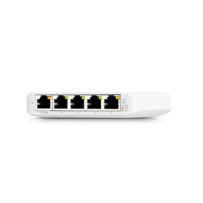 The Ubiquiti UniFi Switch Flex Mini (model USW-FLEX-MINI-3_EU) is a managed switch designed to provide a compact and efficient solution for home and small office networks. This device features five Gigabit Ethernet RJ-45 ports that support high-speed connections (10/100/1000 Mbps), optimizing data transfer and improving communication between connected devices. Its switching capacity reaches 10 Gbit/s, ensuring solid performance for network traffic and supporting a forwarding rate of up to 7.44 MPPS (million packets per second). It also supports Power over Ethernet standards IEEE 802.3af and IEEE 802.3at, with one PoE port supplying power through the network cable, simplifying installation and reducing the need for additional power sources. This switch is powered by an input voltage of 5 V DC and has a maximum power consumption of 2.5 W, making it a low-power, efficient option. Its compact white design, mainly made of metal with plastic components, measures 107.2 mm wide, 70.2 mm deep, and 21.2 mm high, and weighs only 150 grams, allowing easy integration into any space without taking up much room. The unit includes LED indicators for status, activity, link, and speed, enabling simple visual monitoring of operation and connectivity. It is not designed for rack mounting, but its portability and small size allow placement on a desk or in limited spaces. It complies with CE, FCC, and IC certifications, ensuring conformity with international quality and safety standards. Its operating range covers temperatures from -5 to 45 °C and can function in environments with relative humidity between 10 and 90%, ensuring stability in various settings. Overall, the Ubiquiti UniFi Switch Flex Mini combines advanced management, Gigabit connectivity, and PoE compatibility in a compact, efficient format, ideal for those needing a reliable and versatile switch for small professional networks.
