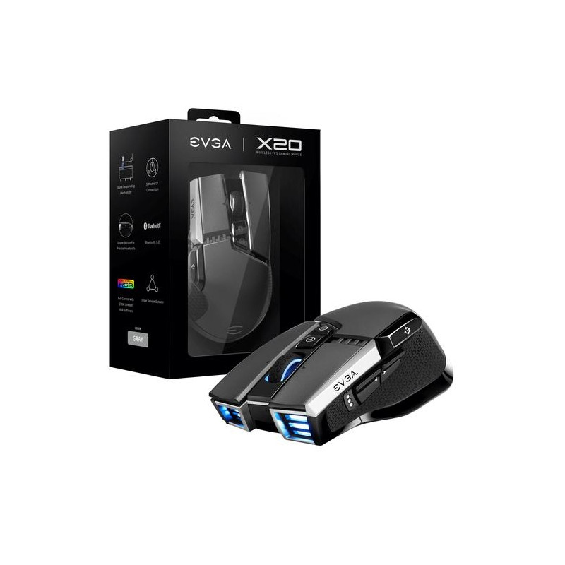 <br />EVGA X20. Form factor: Right-hand. Movement detection technology: Optical, Device interface: RF Wireless + Bluetooth + USB Type-A, Movement resolution: 16000 DPI, Buttons type: Pressed buttons, Buttons quantity: 10, Scroll type: Wheel, AcProduct has been archived