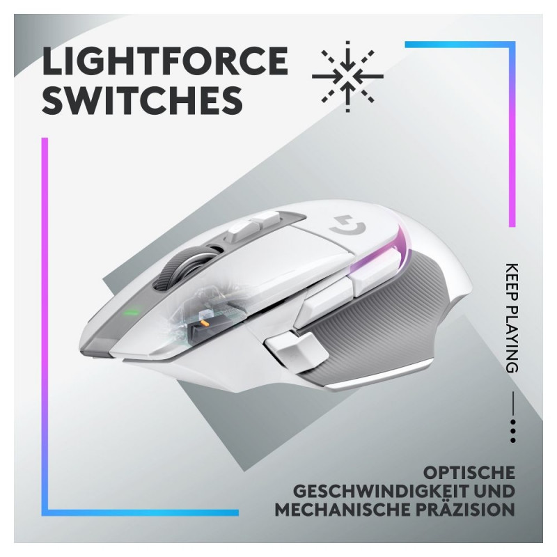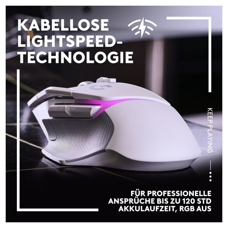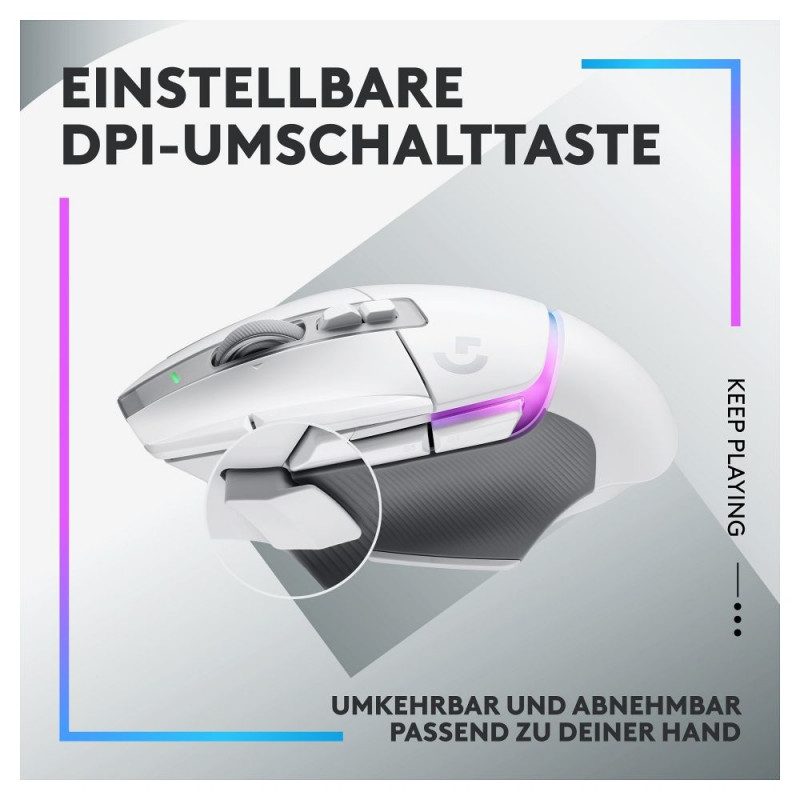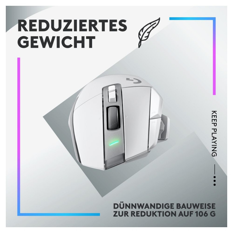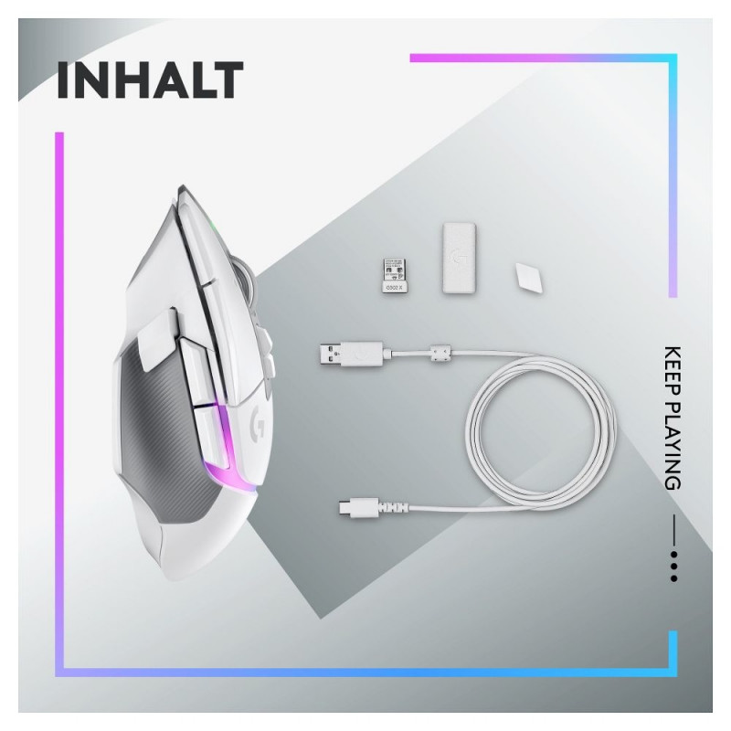 "Logitech G G502 X PLUS. Formfaktor: rechts. Bewegungerfassungs Technologie: Optisch, Geräteschnittstelle: RF Wireless, Bewegung Auflösung: 25600 DPI, Tastentyp: Gedrückte Tasten, Knopfanzahl: 13, Scroll Typ: Rad, Beschleunigung (Max.): 40 G. Farben der Beleuchtung: Multi. Energiequelle: Batterien. Produktfarbe: Weiß"