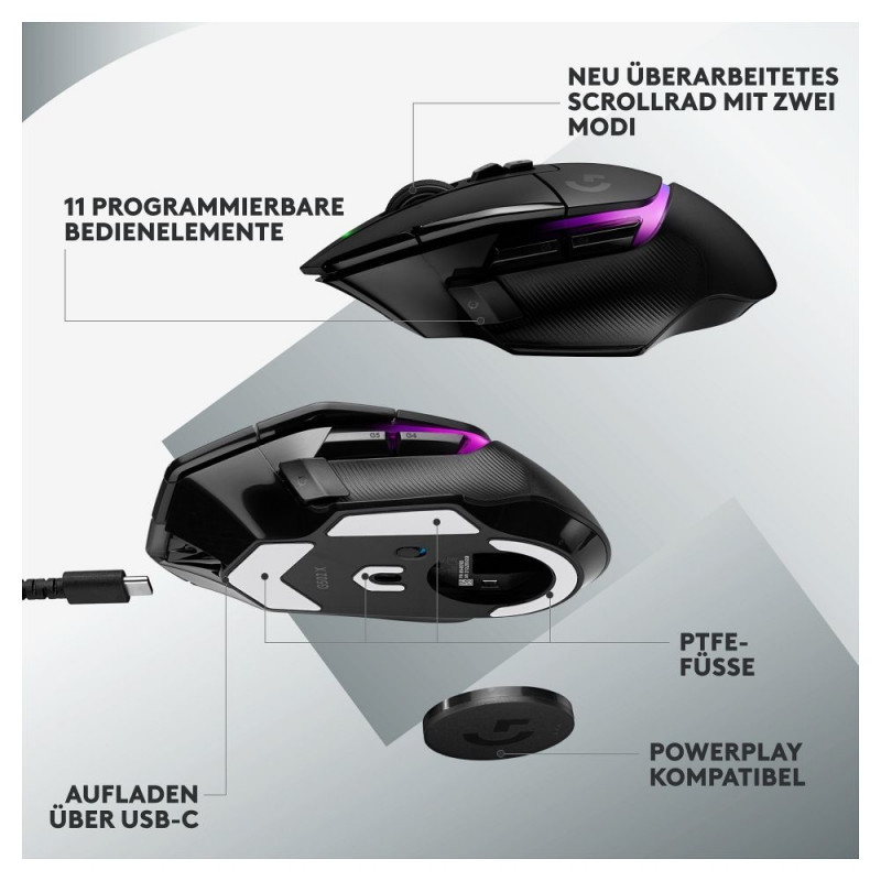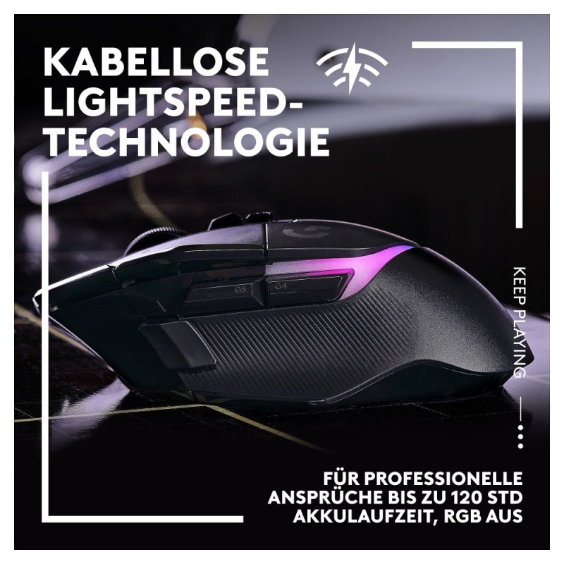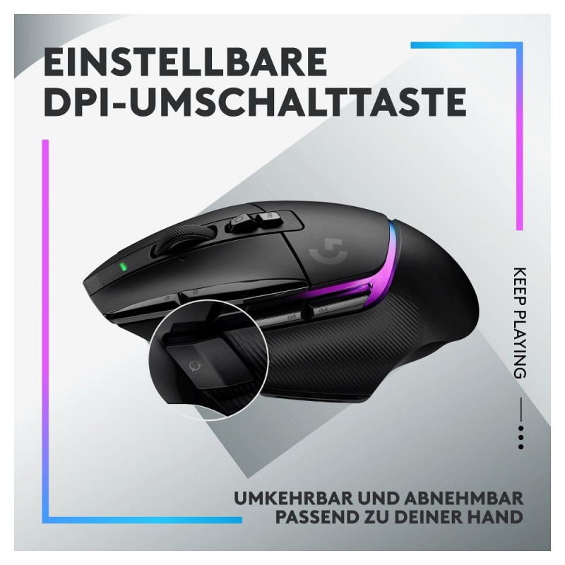 "Logitech G G502 X PLUS. Formfaktor: rechts. Bewegungerfassungs Technologie: Optisch, Geräteschnittstelle: RF Wireless, Bewegung Auflösung: 25600 DPI, Tastentyp: Gedrückte Tasten, Knopfanzahl: 13, Scroll Typ: Rad, Beschleunigung (Max.): 40 G. Farben der Beleuchtung: Multi. Energiequelle: Batterien. Produktfarbe: Schwarz"